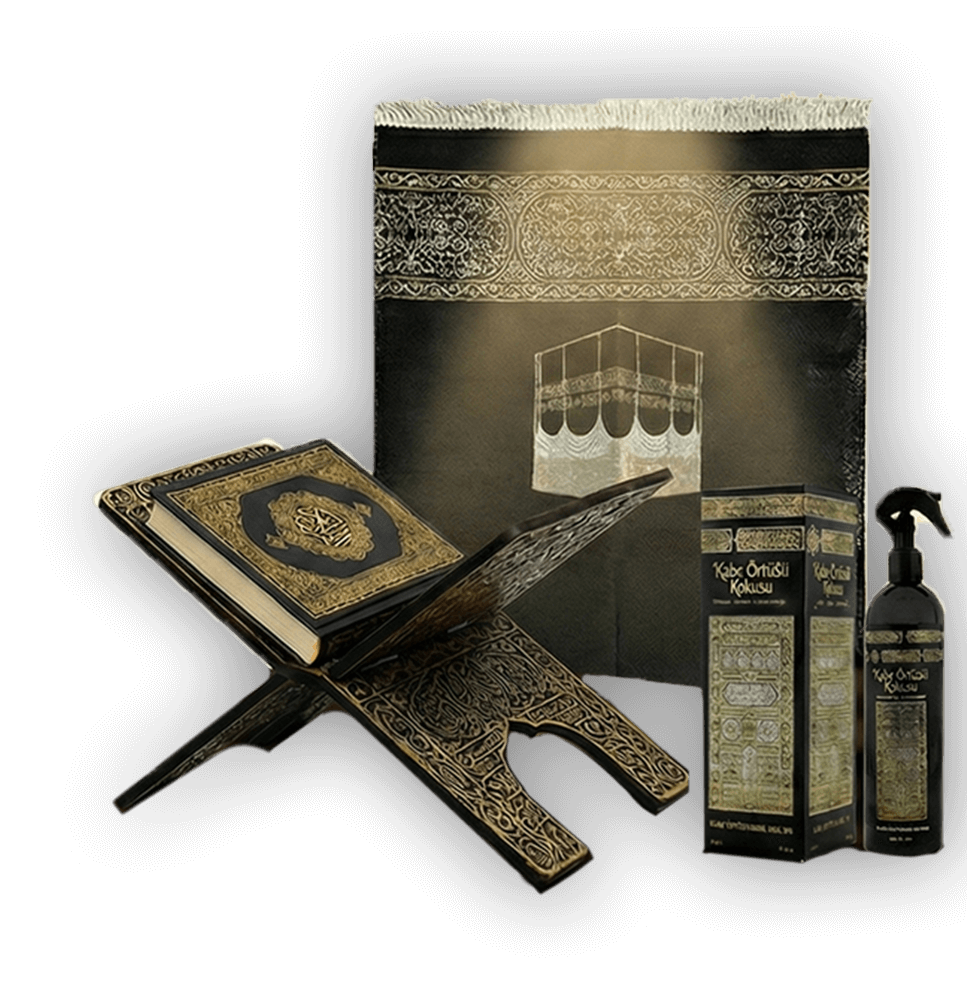 Kampanya içeriği: Kabe Desenli Seccade, Sesli Kur'an-ı Kerim, Ahşap Kabe Kapısı Desenli Rahle ve Orijinal Kabe Örtüsü Kokusu