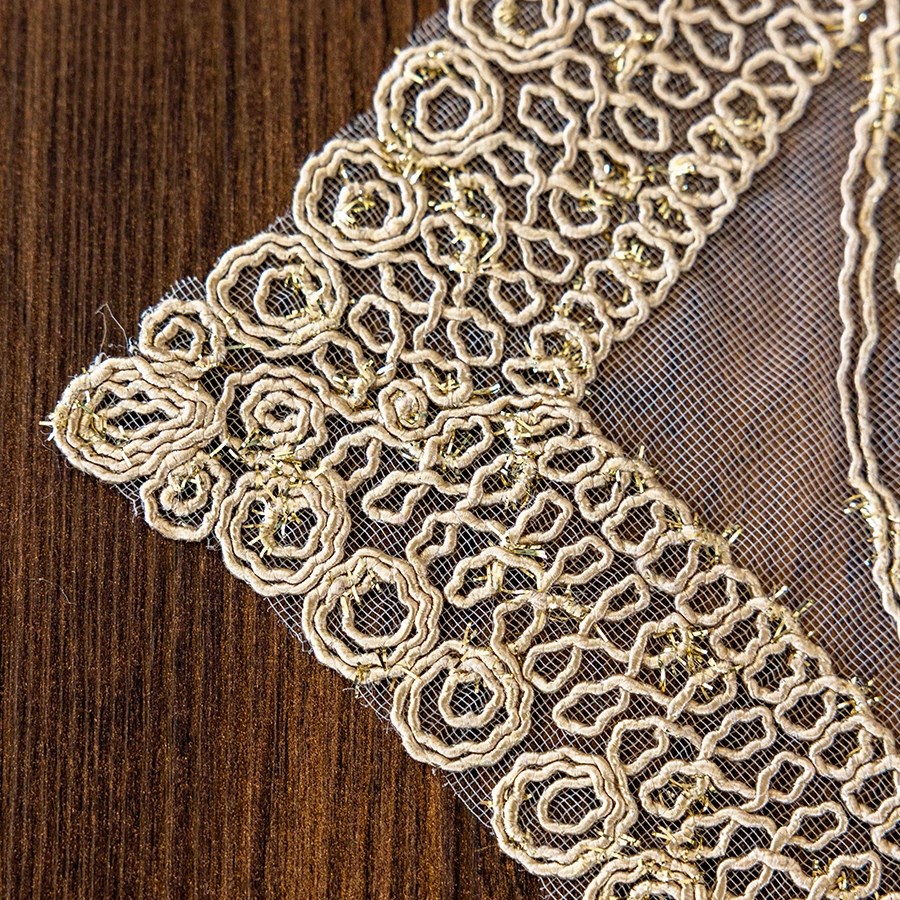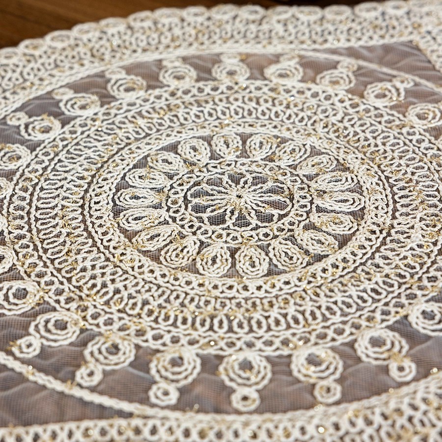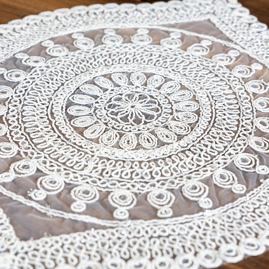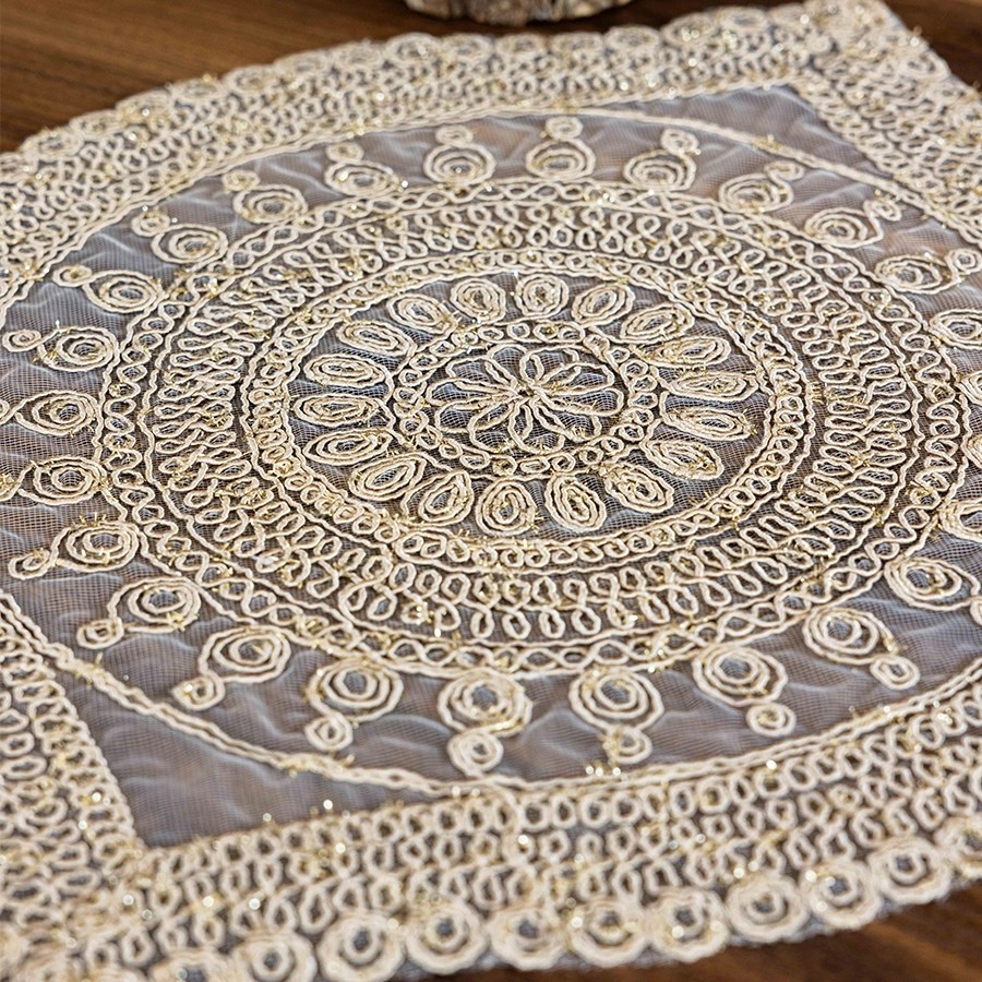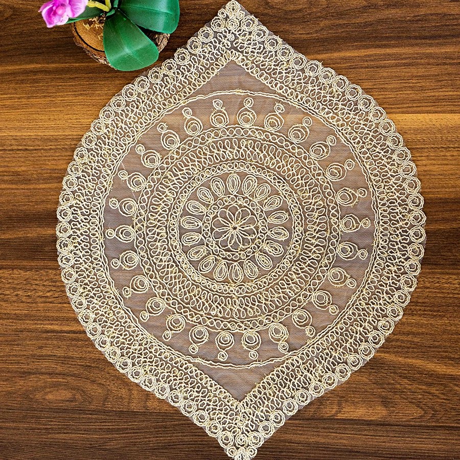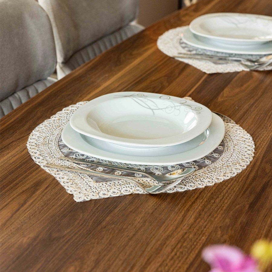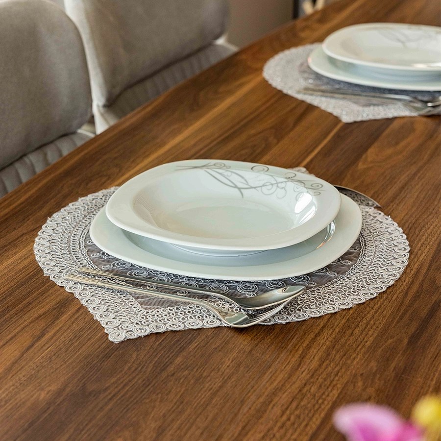 Simli dokusu ışığı şık şekilde yansıtarak masa düzenine zarif bir ışıltı katar. Tabak ve çatal-kaşık yerleşimlerine uygun ölçüleri sayesinde pratik ve kullanışlıdır. Dayanıklı kumaşı uzun ömürlü kullanım sunarken, kolay silinebilen yüzeyi sayesinde temizlik konusunda da büyük kolaylık sağlar.