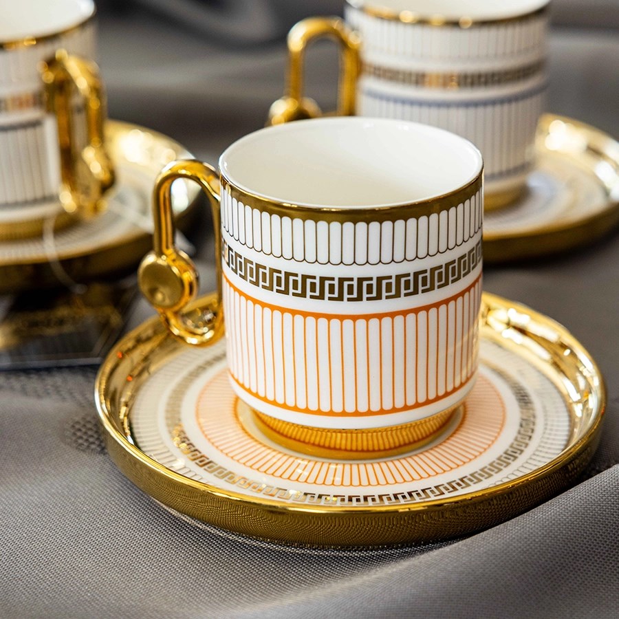 Premium porselen materyali sayesinde dayanıklı ve uzun ömürlü olan Valeria seti, hem günlük kahve keyfi hem de misafir ağırlamaları için ideal bir seçimdir. Altın kaplama kulp ve tabak çevresi, fincanlara ekstra bir ihtişam kazandırır.